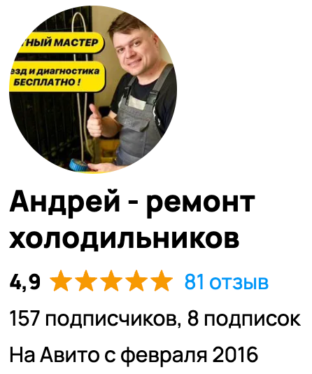 Меня зовут Андрей Бодров. Я частный матер по ремонту бытовых холодильников и морозильных камер. Работаю более 15 лет и гарантирую качественный сервис, это подтверждают отзывы моих клиентов на авито и других площадках.